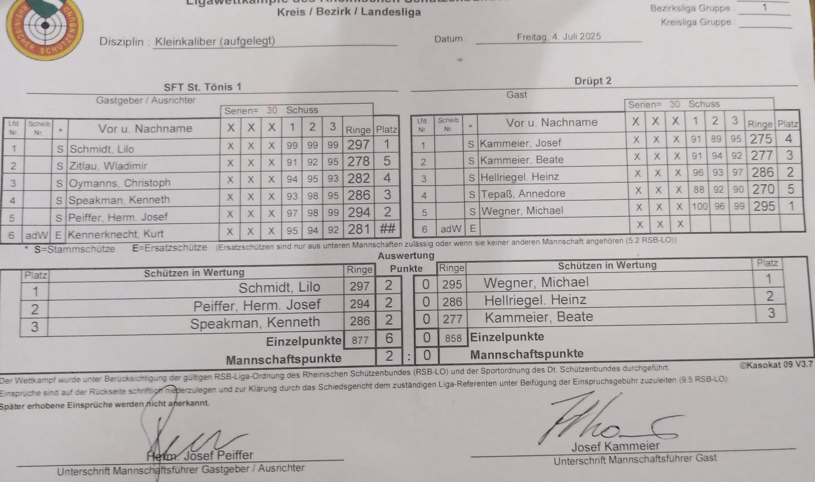 Die Mannschaft Drüpt II KK mit den Schützen Beate Kammeier, Annedore Tepaß, Josef Kammeier, Heinz Hellriegel und Michael Wegner ist am 04.07.2025 in die Ligawettkämpfe 2025 gestartet. Gegen die Mannschaft von SFT St. Tönis wurde der erste Wettkampf leider verloren. Viel Erfolg für die nächsten Wettkämpfe!