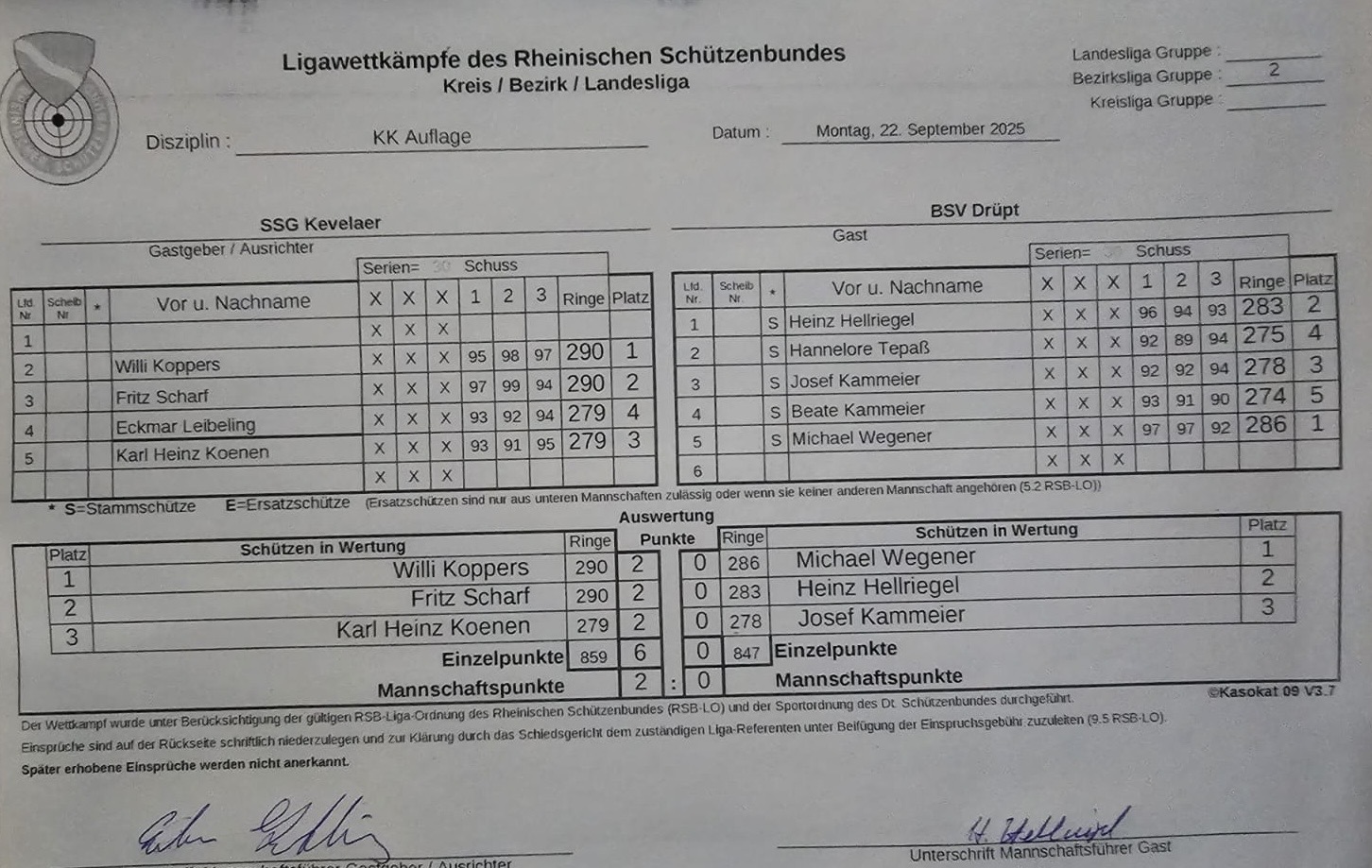 Am 22.09.2025 fand der nächste Auswärtskampf der Saison für die Mannschaft Drüpt II KK statt. Gegen die Mannschaft von SSG Kevelaer wurde der Wettkampf leider verloren. Viel Erfolg für die nächsten Wettkämpfe!