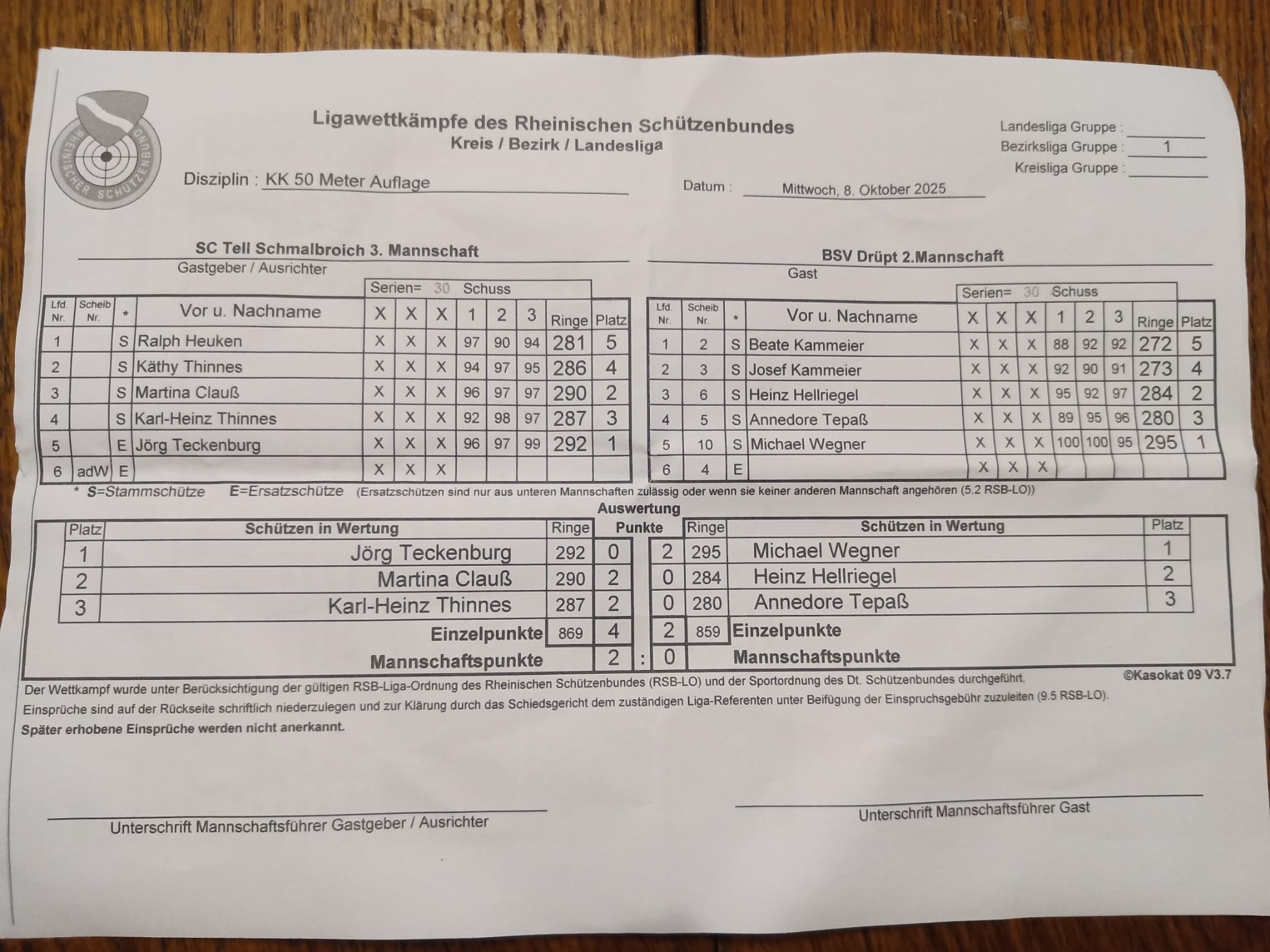 Am 08.10.2025 fand der nächste Auswärtskampf der Saison für die Mannschaft Drüpt II KK statt. Gegen die 3. Mannschaft vom SC Tell Schmalbroich wurde der Wettkampf leider verloren. Viel Erfolg für die nächsten Wettkämpfe!