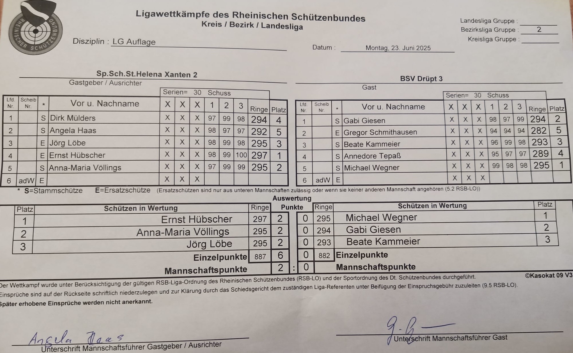 Die Mannschaft Drüpt III LG Auflage mit den Schützen Beate Kammeier, Annedore Tepaß, Gabi Giesen, Heinz Hellriegel, Michael Wegner und Ersatzschütze Gregor Schmithausen ist am 23.06.2025 in die Ligawettkämpfe 2025 gestartet. Gegen die Mannschaft von den Sp.Sch. St. Helena Xanten wurde der erste Wettkampf leider verloren. Viel Erfolg für die nächsten Wettkämpfe!