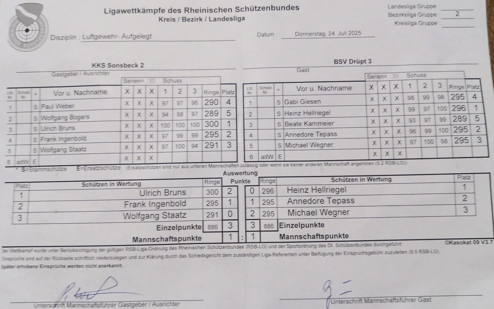 Am 24.07.2025 fand der nächste Auswärtskampf der Saison für die Mannschaft Drüpt III LG Auflage statt. Gegen die 2. Mannschaft von KKS Sonsbeck ging der Wettkampf unentschieden aus. Viel Erfolg für den letzten Wettkampf!