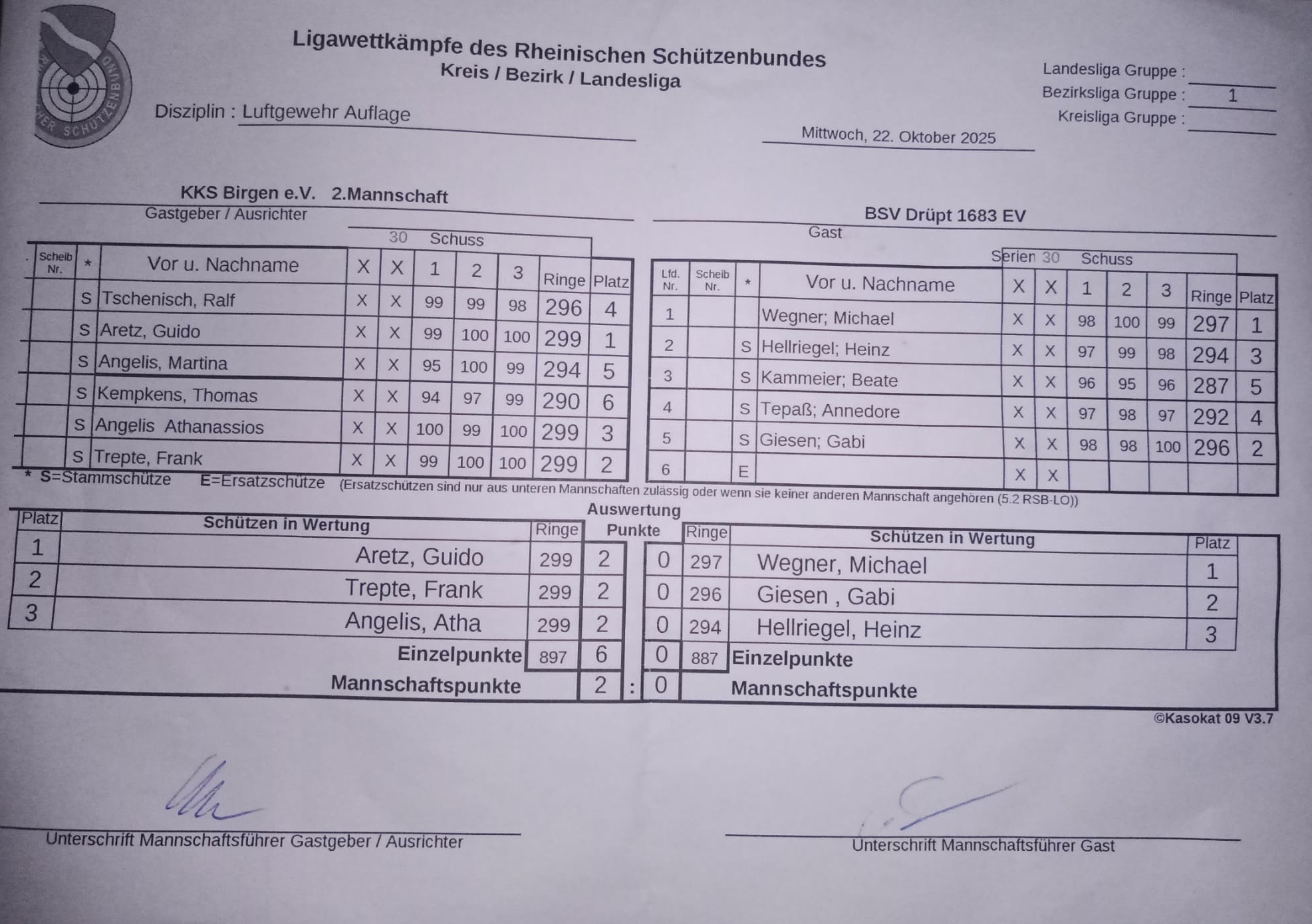 Am 22.10.2025 fand der nächste Auswärtskampf der Saison für die Mannschaft Drüpt III LG Auflage statt. Gegen die 2. Mannschaft von KKS Birgen wurde der Wettkampf leider verloren. Viel Erfolg für den letzten Wettkampf!