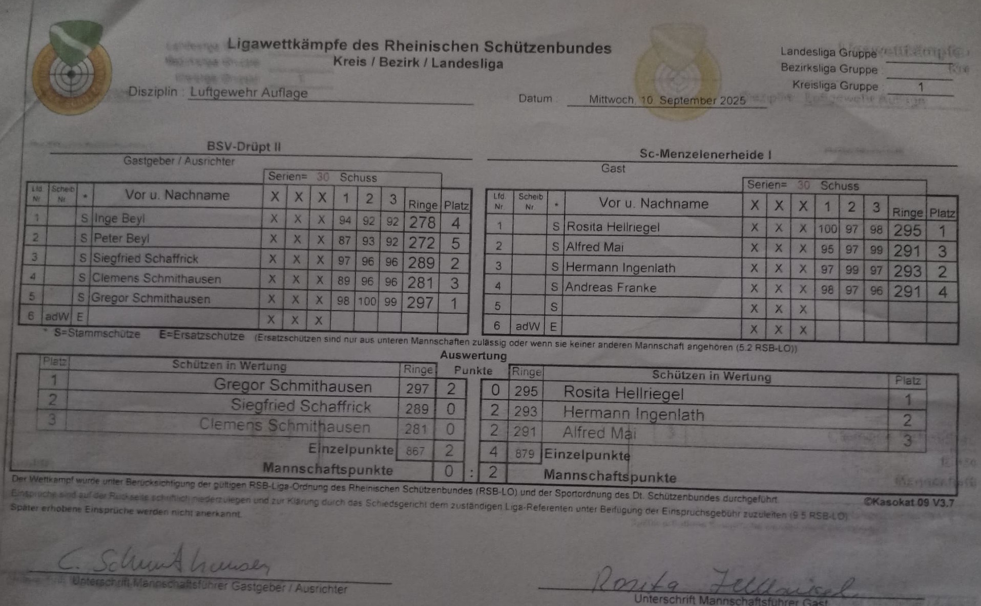 Am 10.09.2025 fand der nächste Heimkampf der Saison für die Mannschaft Drüpt II LG aufgelegt statt. Gegen die 1. Mannschaft vom SC Menzelenerheide wurde der Wettkampf leider verloren. Viel Erfolg für die nächsten Wettkämpfe!