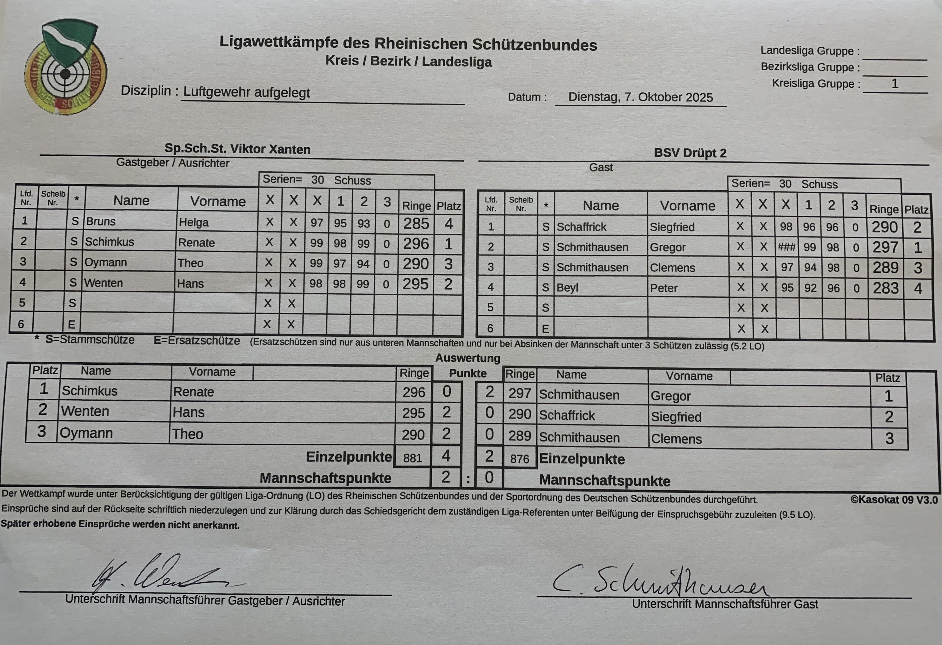 Am 07.10.2025 fand der nächste Auswärtskampf der Saison für die Mannschaft Drüpt II LG aufgelegt statt. Gegen die 2. Mannschaft von Viktor Xanten wurde der Wettkampf leider verloren. Viel Erfolg für die nächsten Wettkämpfe!