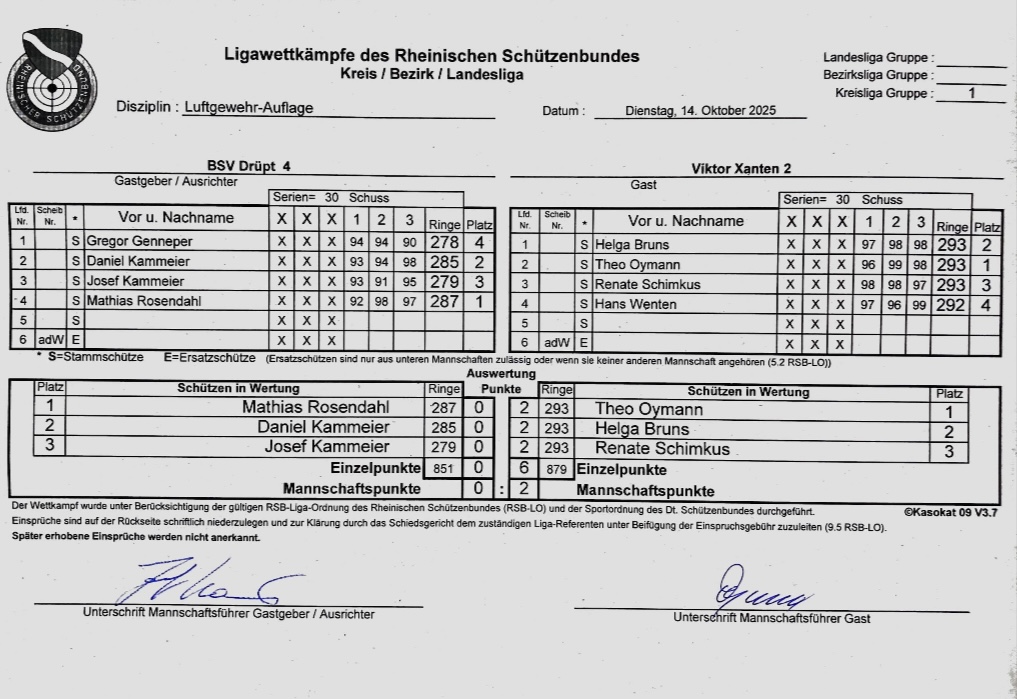 Die neue Mannschaft Drüpt IV LG Auflage mit den Schützen Josef Kammeier, Daniel Kammeier, Mathias Rosendahl, Gregor Genneper und Lutz Janssen ist am 14.10.2025 in die Ligawettkämpfe 2025 gestartet. Gegen die 2.Mannschaft von Viktor Xanten wurde der erste Wettkampf leider verloren. Viel Erfolg für die nächsten Wettkämpfe!