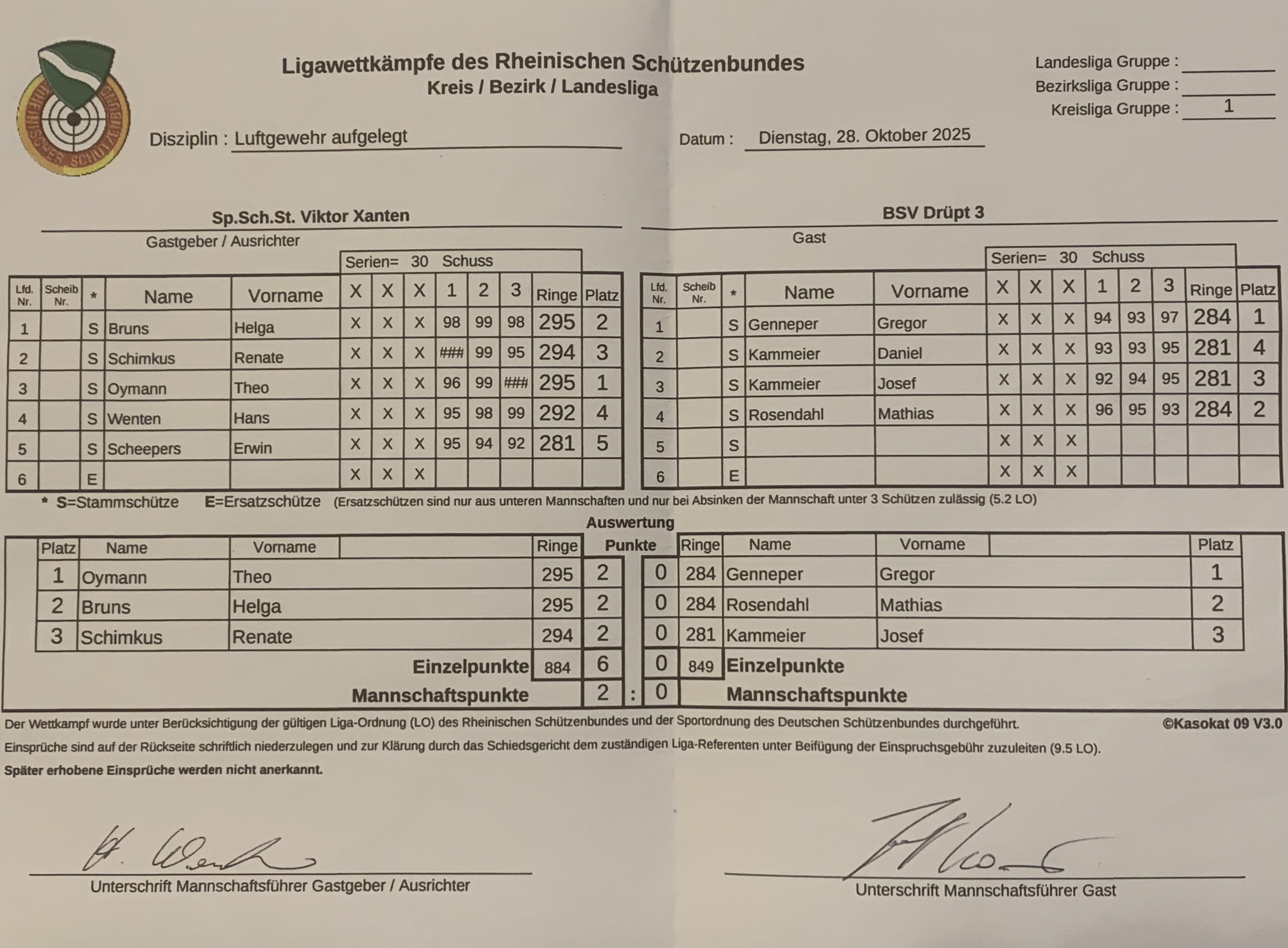 Am 28.10.2025 fand der nächste Heimkampf für die Mannschaft Drüpt IV LG aufgelegt statt. Gegen die 2. Mannschaft von Viktor Xanten wurde der Wettkampf leider verloren. Viel Erfolg für die nächsten Wettkämpfe!