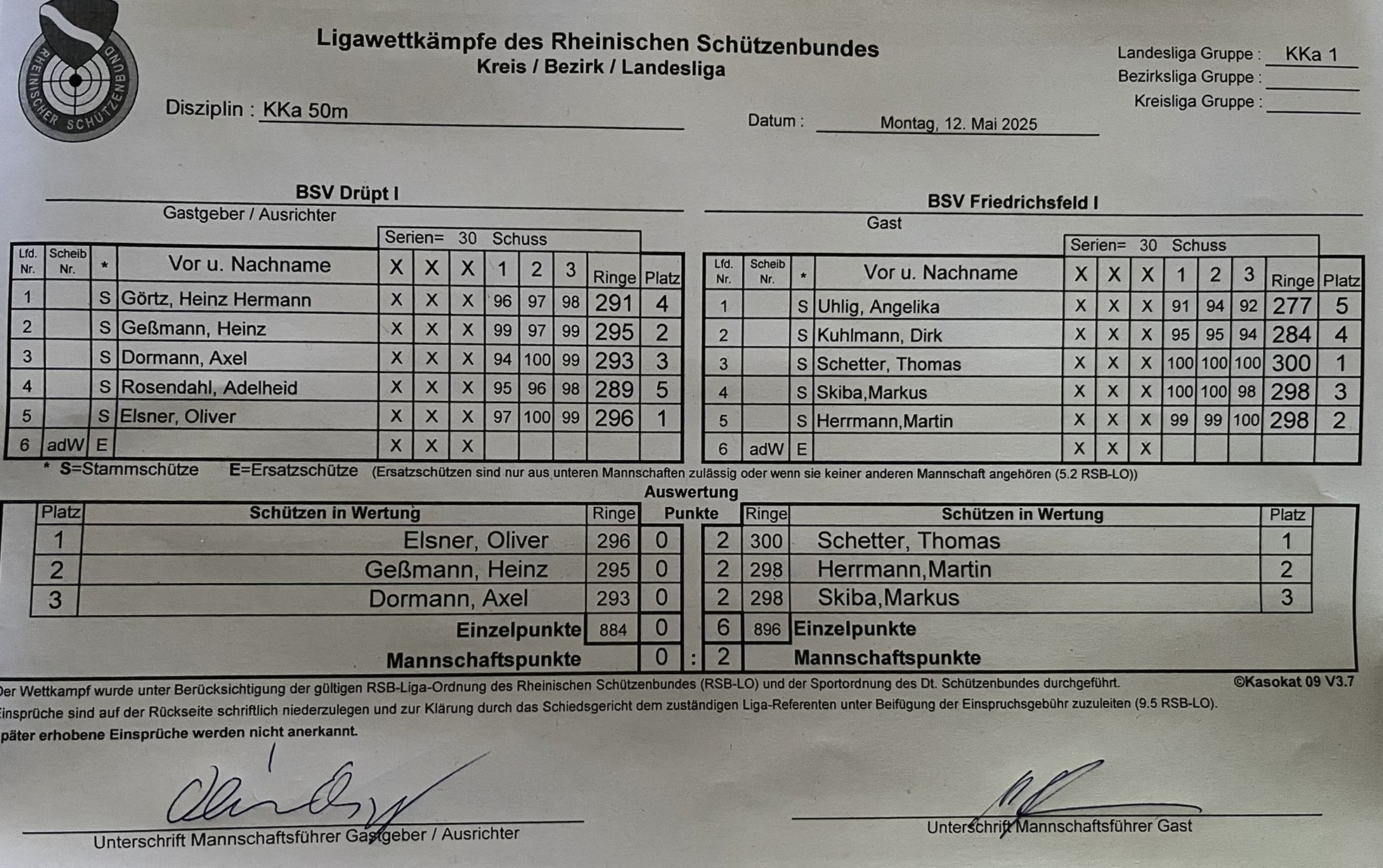 Am 12.05.2025 startete die Mannschaft Drüpt I KK in die neue Landesligasaison 2025. Unsere Mannschaft bestehend aus Adelheid Rosendahl, Oliver Elsner, Axel Dormann, Heinz Geßmann und Heinz-Hermann Görtz verlor den Wettkampf gegen den BSV Friederichsfeld. Viel Erfolg für die nächsten Wettkämpfe!