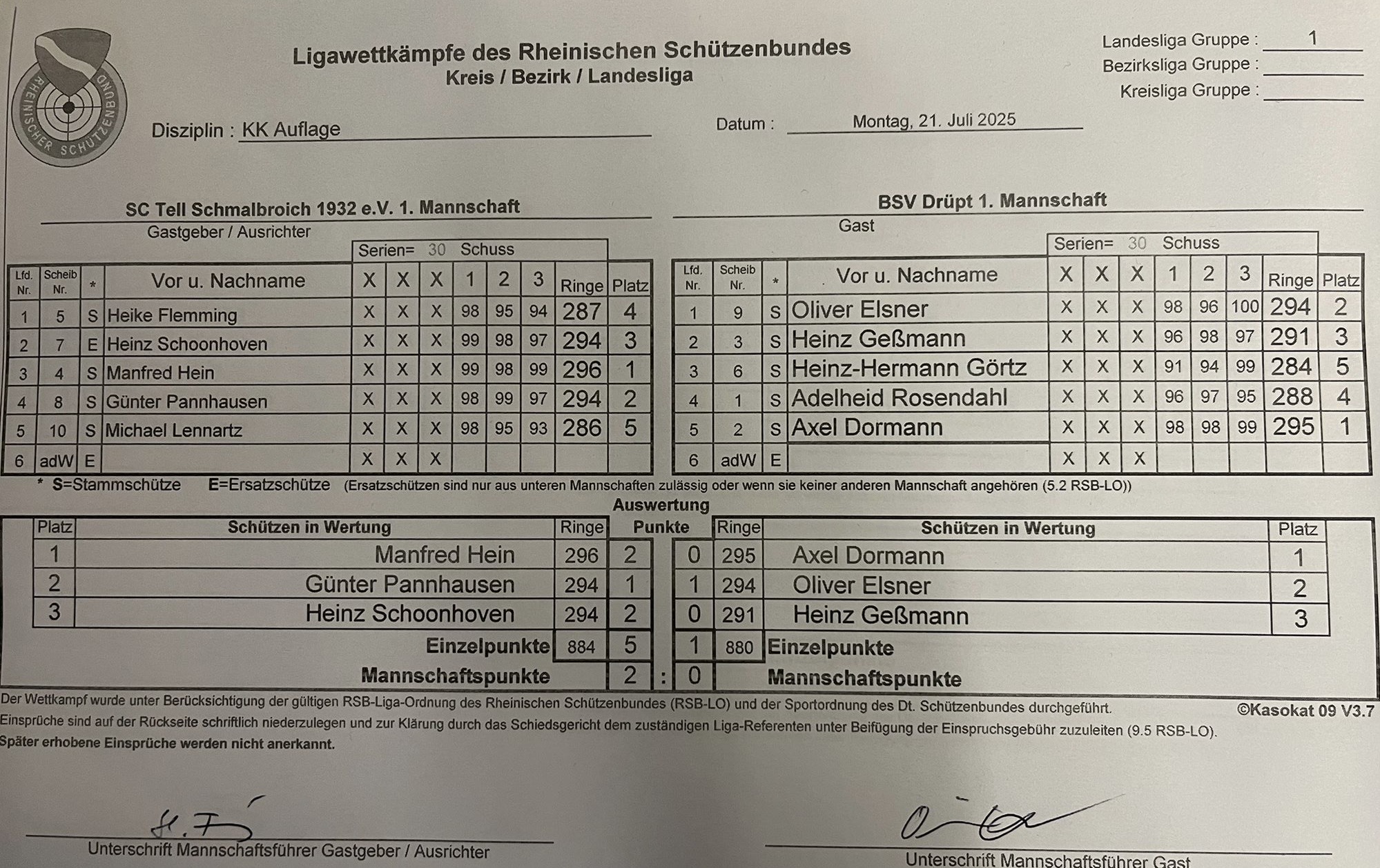 Am 21.07.2025 fand der nächste Auswärtskampf der Saison für die Mannschaft Drüpt I KK statt. Gegen die 1. Mannschaft des SC Tell Schmalbroich wurde der Wettkampf leider verloren. Viel Erfolg für die nächsten Wettkämpfe!