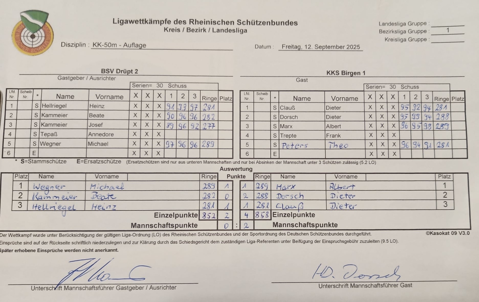 Am 12.09.2025 fand der nächste Heimkampf der Saison für die Mannschaft Drüpt II KK statt. Gegen die 1. Mannschaft von KKS Birgen wurde der Wettkampf leider verloren. Viel Erfolg für die nächsten Wettkämpfe!
