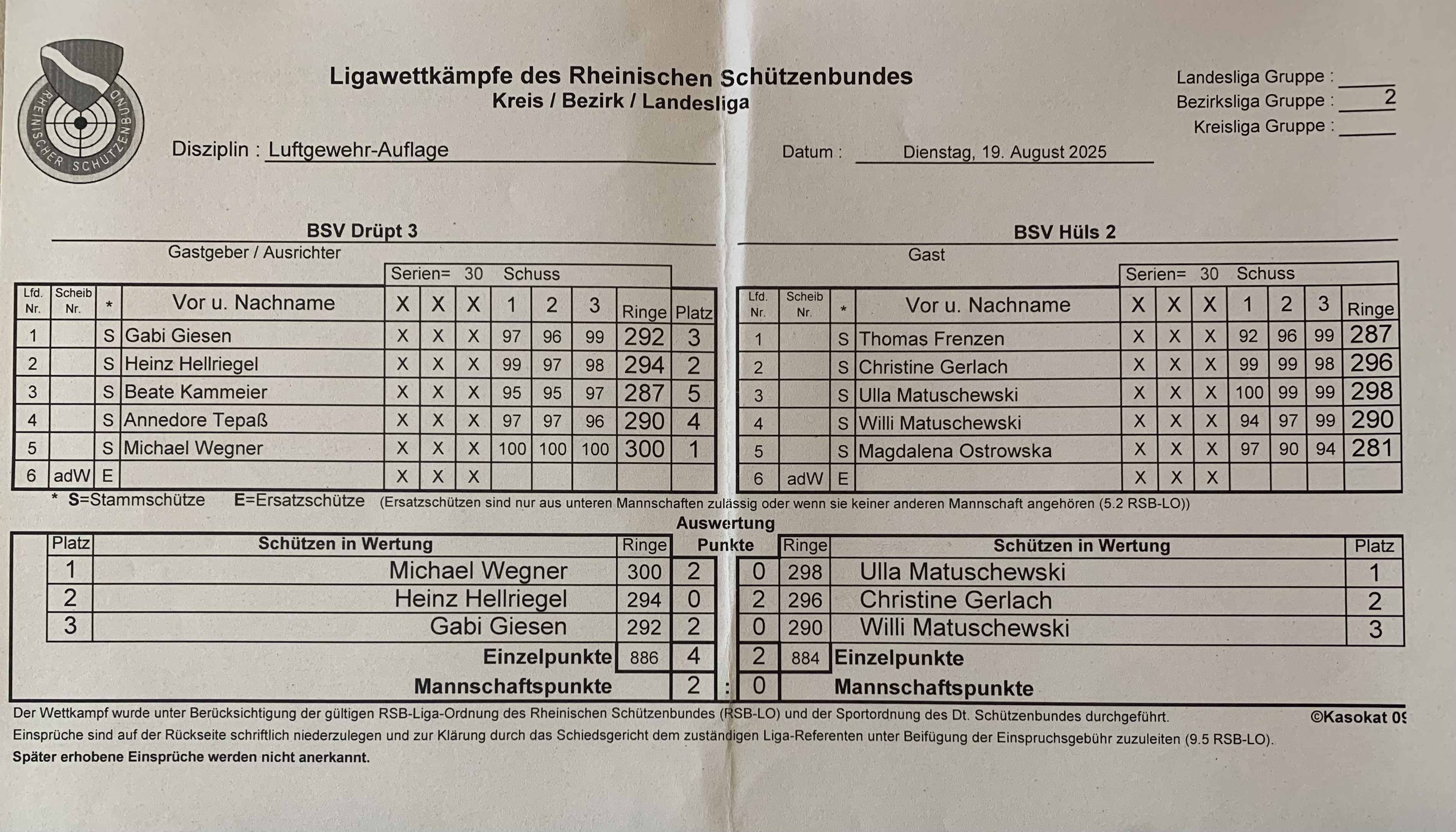 Am 19.08.2025 fand der nächste Heimkampf der Saison für die Mannschaft Drüpt III LG aufgelegt statt. Gegen die 2. Mannschaft des BSV Hüls wurde der Wettkampf gewonnen. Viel Erfolg für die nächsten Wettkämpfe!
