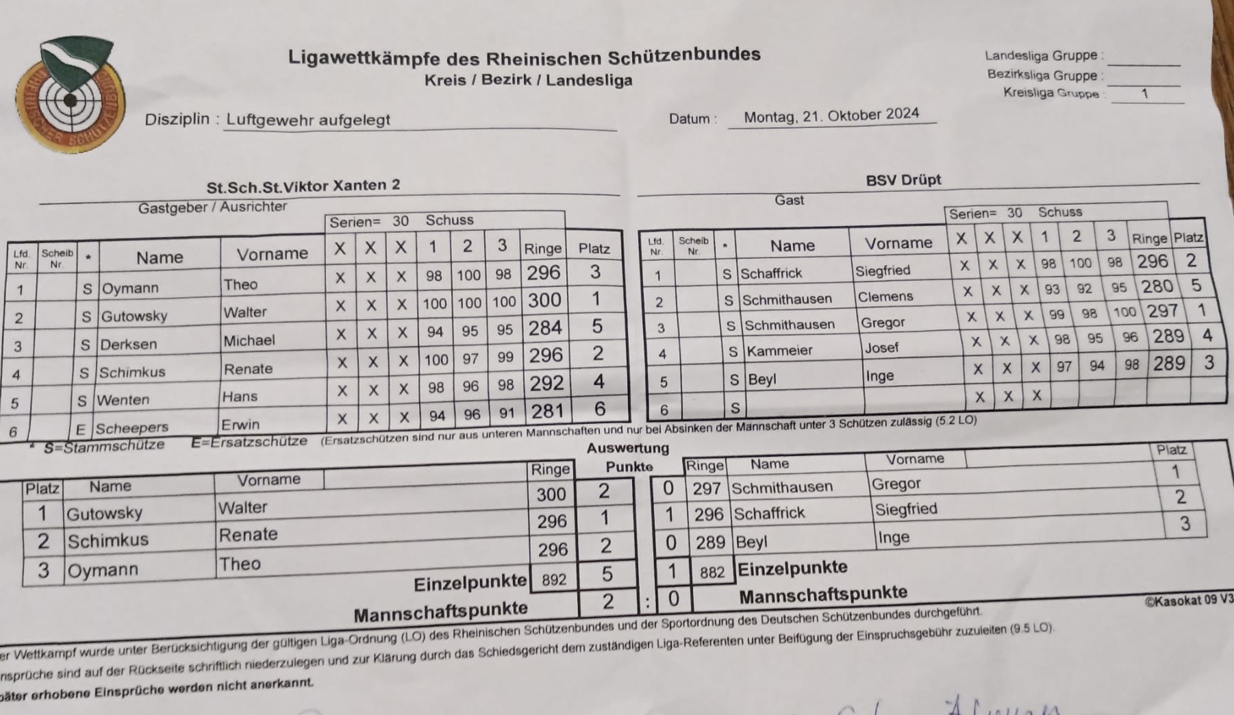 Am 21.10.2024 fand der nächste Auswärtskampf der Saison für die Mannschaft Drüpt II LG aufgelegt statt. Gegen die 2. Mannschaft von Viktor Xanten wurde der Wettkampf leider verloren. Viel Erfolg für die nächsten Wettkämpfe!