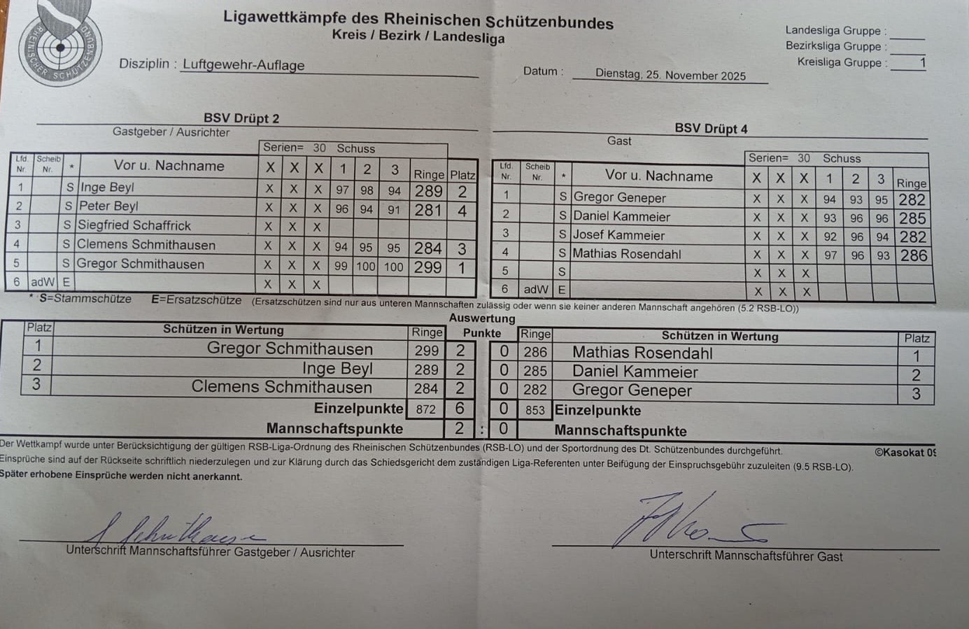 Am 25.11.2025 kam es zum Drüpter-Duell in der Kreisliga. In der Disziplin LG-Auflage schossen die Mannschaft Drüpt II LG Auflage und Drüpt IV LG Auflage gegeneinander. Es konnte sich unsere 2. Mannschaft durchsetzen, am 09.12.2025 kommt es zum Rückkampf. Viel Erfolg an beide Mannschaften!