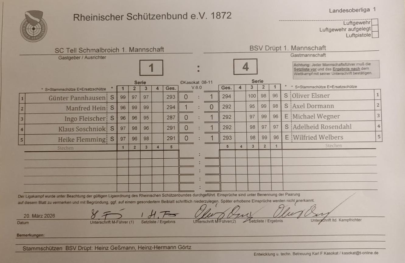 Am 20.03.2026 startete unsere 1. Mannschaft bestehend aus Oliver Elsner, Adelheid Rosendahl, Axel Dormann, Heinz Geßmann und Heinz-Hermann Görtz gegen den SC Tell Schmalbroich in die Ligawettkämpfe. Unsere 1. Mannschaft wurde in diesem Wettkampf von unseren 2 Ersatzschützen Michael Wegner und Wilfried Welbers unterstützt, der Wettkampf konnte mit 4:1 gewonnen werden. Ein gelungener Einstieg in die neue Liga und in die neue Saison. Herzlichen Glückwunsch!